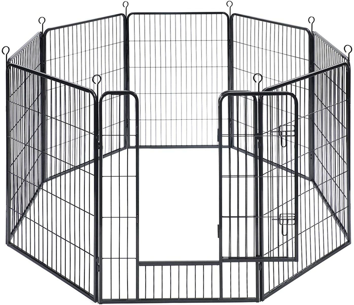 Het hek meet in totaal 160 x 160 cm en bestaat uit acht stevige metalen panelen (80 x 80 cm). De strakke zwarte afwerking geeft een moderne uitstraling en is weerbestendig voor zowel binnen- als buitengebruik.