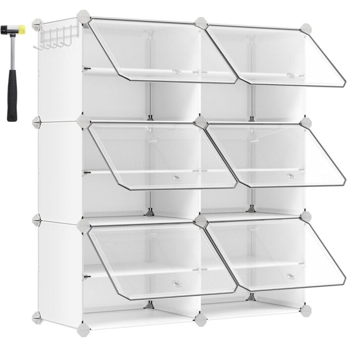 De Hoppa! in elkaar grijpende schoenenrek kast is een handige opbergoplossing voor uw schoenen, tassen en kleding. Met voldoende ruimte voor maximaal 24 paar schoenen, biedt dit modulaire opbergmeubel ook plaats aan andere items zoals hoeden en hondenriemen dankzij de ruimtebesparende zijhaken. Dit schoenenrek is gebouwd om lang mee te gaan, met een stalen frame, kunststof panelen en hoogwaardige connectoren die elk compartiment ondersteunen tot 5 kg. De meegeleverde anti-tipkit zorgt voor extra veiligheid, vooral in woon- of slaapkamers. Montage en demontage van dit opbergmeubel is eenvoudig en snel, mede dankzij de meegeleverde rubberen hamer. U kunt de configuratie aanpassen en het in verschillende lay-outs gebruiken, afhankelijk van uw behoeften. De doorzichtige deuren van dit schoenenrek bieden niet alleen stof- en waterdichte bescherming, maar maken het ook gemakkelijk om de schoenen binnenin te bekijken. Doorvoertules op de deuren zorgen voor een goede ventilatie, en het gehele rek is gemakkelijk schoon te maken voor langdurig gebruik.