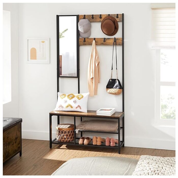 Het ontwerp biedt zowel praktische opslagmogelijkheden als een esthetische uitstraling met een industriële flair. Het handige bankgedeelte en de vele haken maken het gemakkelijk om kleding en accessoires georganiseerd te houden.