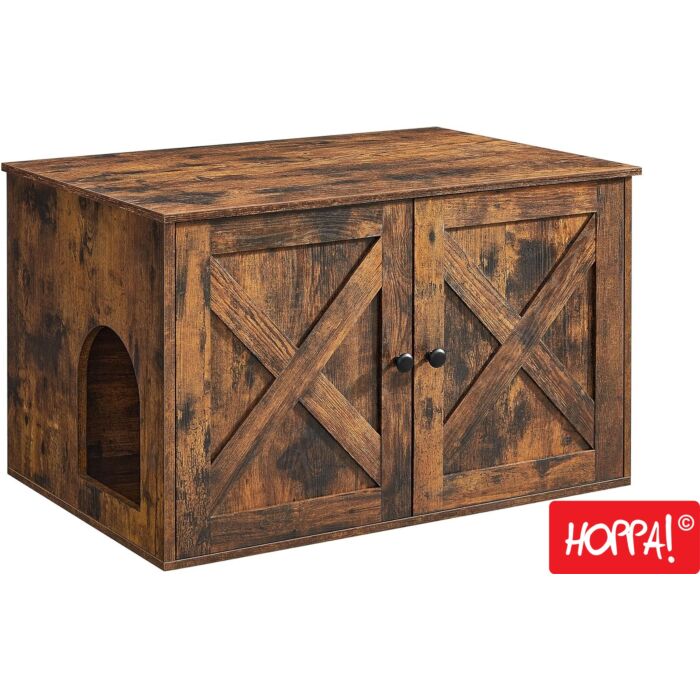 De Hoppa! vintage bruine kattenbak met deuren is de perfecte combinatie van comfort voor uw kat en stijlvol meubilair voor uw interieur. Met een binnenruimte van 51 x 51 x 47 cm biedt hij plaats aan vrijwel iedere standaard kattenbak, terwijl de scheidingswand extra privacy garandeert. Het stevige tafelblad kan tot 60 kg dragen, waardoor deze kattenbak ook functioneert als elegant bijzetmeubel. Gemaakt van hoogwaardige spaanplaat met een eenvoudig te reinigen oppervlak, is hij zowel duurzaam als onderhoudsvriendelijk. Het unieke vintage-design met deuren voegt direct karakter toe aan uw woonruimte. Dankzij de duidelijke handleiding en geëtiketteerde onderdelen is de montage een fluitje van een cent.