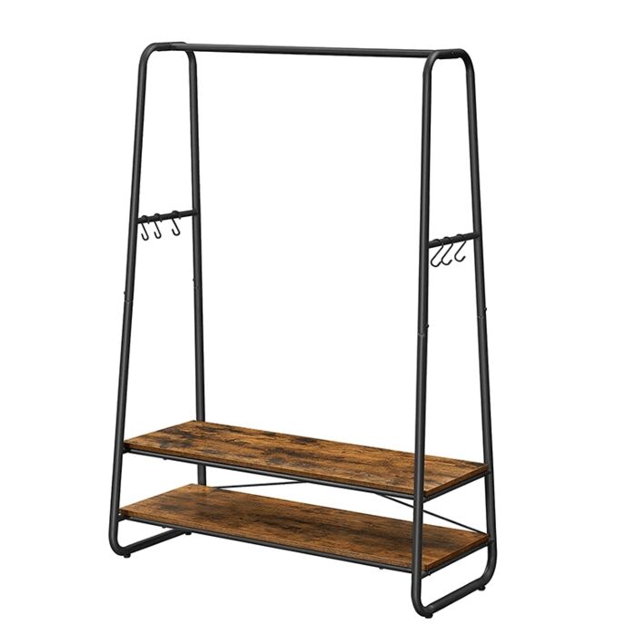 Met 2 legplanken, een kledingstang en 6 haken in S-vorm biedt dit kledingrek voldoende ruimte voor het organiseren van kleding en accessoires. Het stalen frame zorgt voor stevigheid en duurzaamheid, terwijl het vintage ontwerp een moderne touch geeft.
