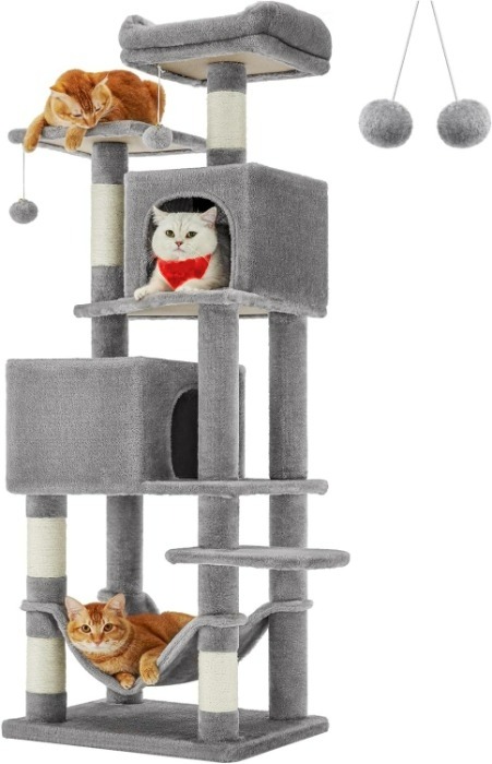 - Meertraps speelplaats voor katten met 5 krabzuilen, 2 platforms, 2 kattenholletjes, hangmat en 2 pluche ballen