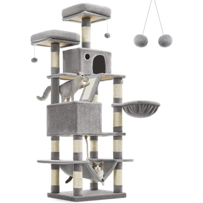 Deze hoogwaardige krabpaal van 168 cm is speciaal ontworpen voor katten die actief zijn en hun natuurlijke krabbehoeften willen vervullen. Met meerdere niveaus biedt deze krabpaal een scala aan mogelijkheden voor zowel spelen als ontspanning. De geïntegreerde elementen zoals pompons, platforms en grotten maken deze krabpaal tot een waar speelparadijs voor je kat.