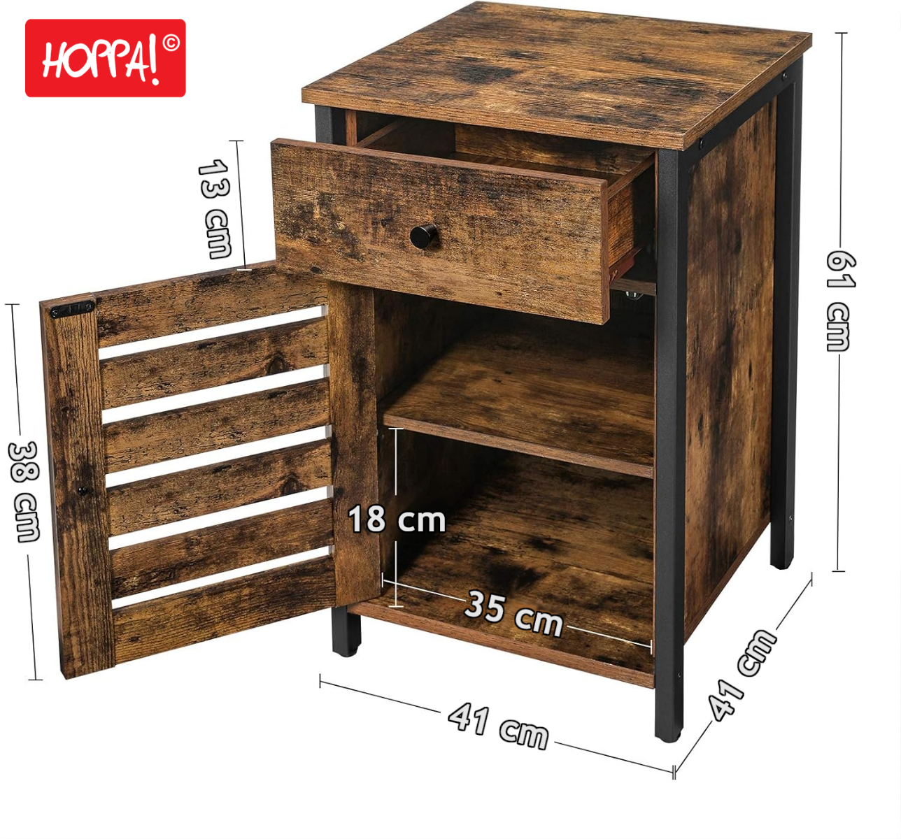 Dit Hoppa! nachtkastje is een perfecte aanvulling op uw slaapkamer of woonruimte. Met een combinatie van robuust staal en duurzame houtsnippers biedt dit kastje een hoge stabiliteit en draagvermogen. Het vintage ontwerp, inclusief matzwart metalen frame en lamellendeur, geeft een charmante uitstraling aan elke ruimte.