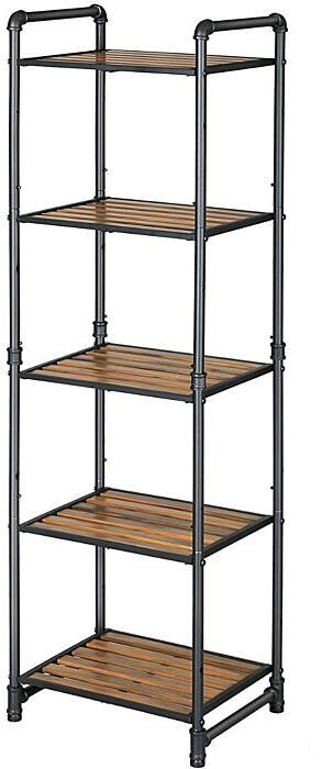 Het opbergrek heeft een afmeting van 40 cm in lengte, 30 cm in breedte en 130 cm in hoogte. Het stevige ontwerp bestaat uit een zwart stalen frame, wat zorgt voor een moderne uitstraling, gecombineerd met planken van rustiek bruin materiaal. Dit maakt het niet alleen esthetisch aantrekkelijk, maar ook duurzaam en stevig geschikt voor langdurig gebruik.
