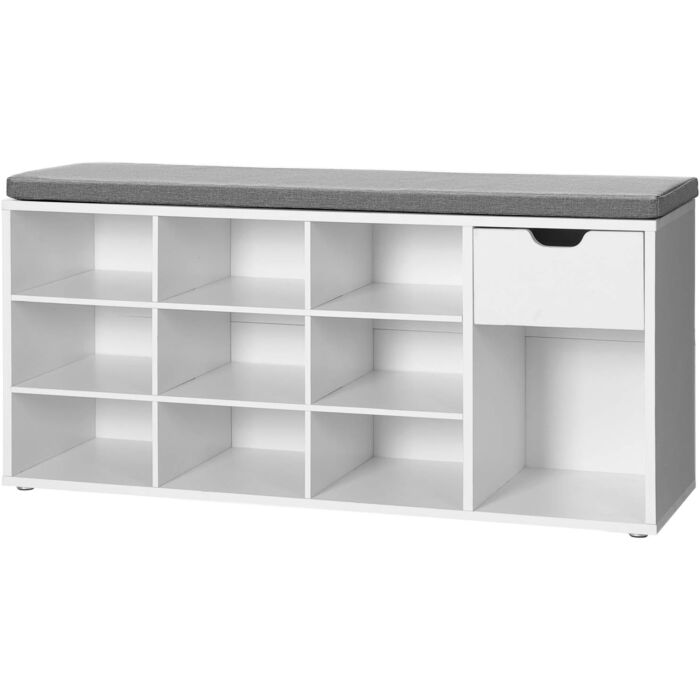 De schoenenbank is ideaal voor het opbergen van schoenen en accessoires, waardoor je huis netjes en georganiseerd blijft. De gewatteerde zitting biedt comfortabele zitmogelijkheden en kan tot 200 kg dragen voor duurzame ondersteuning.