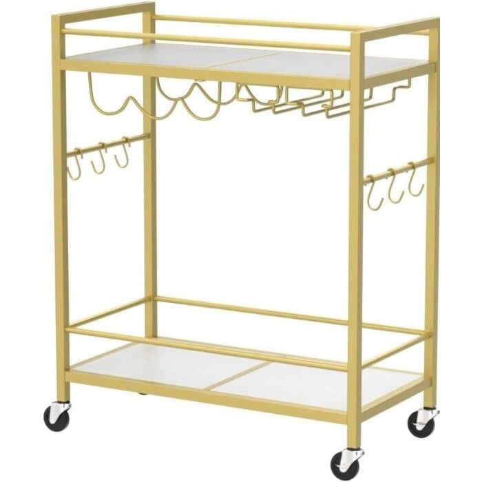 De wagen staat op vier 360° roterende zwenkwielen, waarvan er twee zijn voorzien van remmen voor extra stabiliteit. Het handvat maakt verplaatsen eenvoudig en de zes S-vormige haken bieden plek voor klein keuken- of baraccessoire.