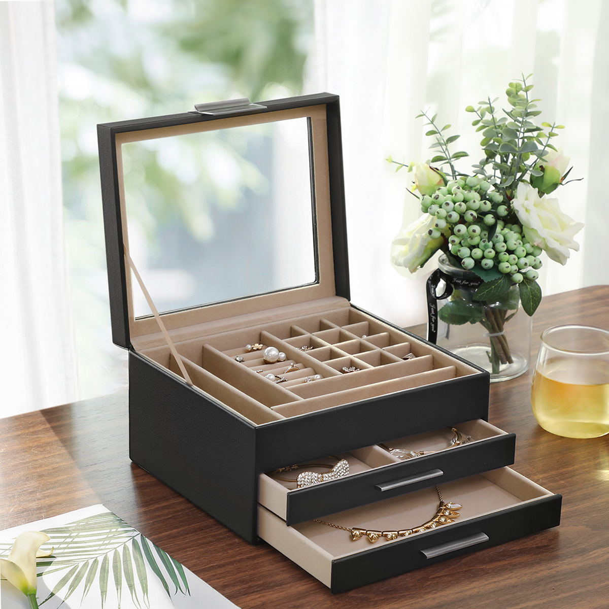 Hoppa! | Sieradendoos | Glazen deksel, 3 niveaus, 2 laden | Zwart