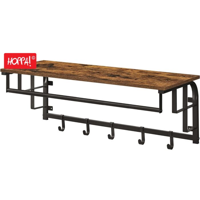 Hoppa! Wandkapstok | 3-in-1 ontwerp, 5 haken, legbord | Walnoot Bruin-Zwart | 80 x 30 x 27 cm