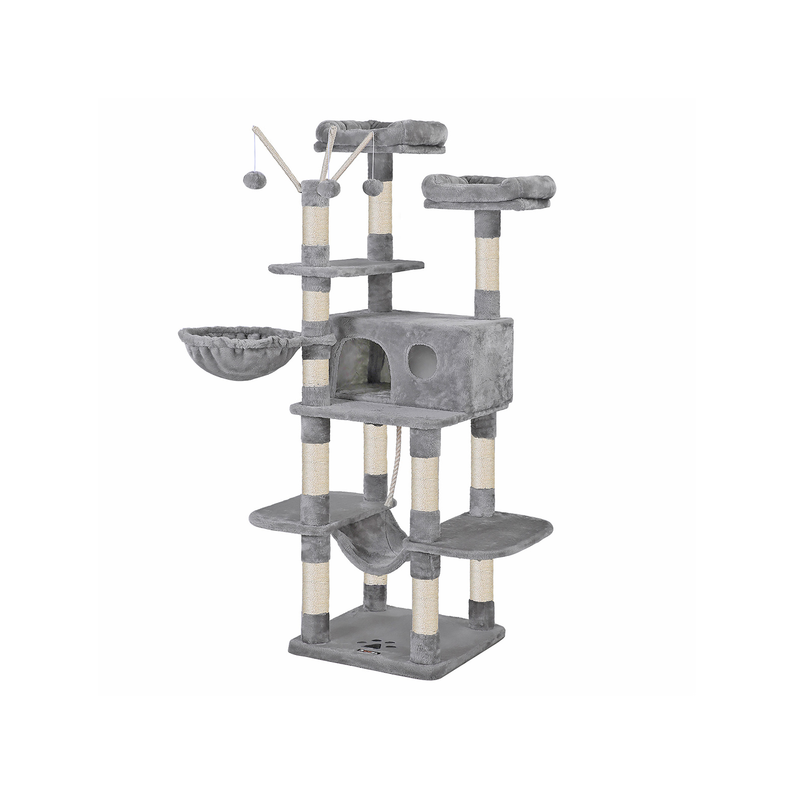 - All-in-one kattentoren met 2 platforms, 1 kattenhuis, 1 hangmat, 3 kattenballetjes en 1 sisaltouw