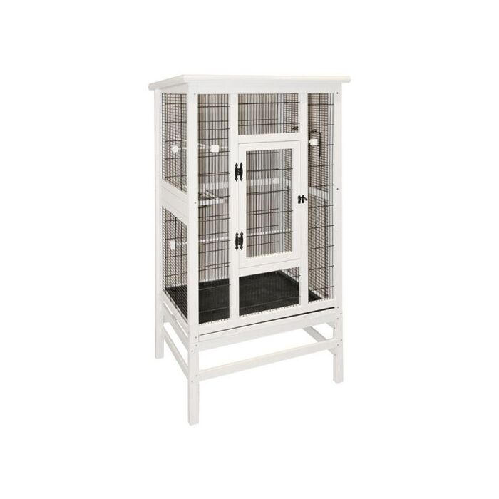 Luxe massief houten voliere waarvan de houten body is behandeld met diervriendelijke verf en voorzien van een weersbestendig dak. Deze voliere is voorzien van een uitneembare kunststof schuiflade, wat het schoonmaken een stuk eenvoudiger maakt.