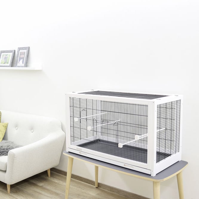 De volière beschikt over een uitneembare kunststof schuiflade voor eenvoudige reiniging, een afneembaar dak voor gemakkelijke toegang, en een vogel- en diervriendelijke verf die de veiligheid en het welzijn van de vogels garandeert.