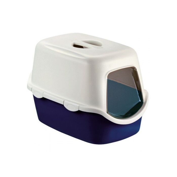Kattenbak met kunststof overkapping en bevestigingsclips, voorzien van klapdeur, geurfilter en handvat.
