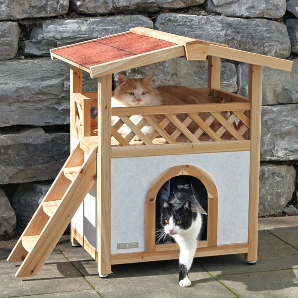 Duurzaam kattenhuis Tirol met puntdak en bekleed met watervast bitumen, wat de nodige bescherming biedt tegen direct zonlicht en warmte op hete dagen