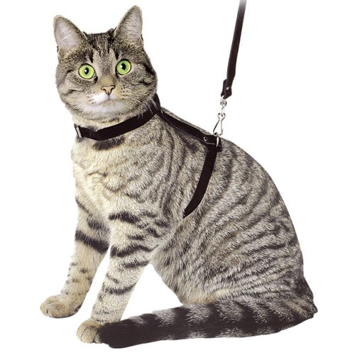 Eenvoudig maar doeltreffend kattenharnas van suèdeleer. Het harnas is gemakkelijk aan te trekken.