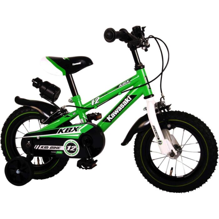 Kawasaki 12 inch jongensfiets 85% afgemonteerd. Deze supercoole nieuwe Kawasaki jongensfiets is speciaal ontwikkeld voor alle raceliefhebbers. Kawasaki is een wereldberoemd Japans motorfietsmerk. Deze fiets is dan ook helemaal in de stijl van dit stoere merk. De fiets is voorzien van een fietsbel en 2 handremmen, dus geen terugtraprem. Verder heeft de fiets een handige bidonhouder. Om snel te kunnen leren fietsen heeft de fiets zijwieltjes. De kettingkast is gesloten. Op deze fiets wil iedere jongen wel op avontuur!