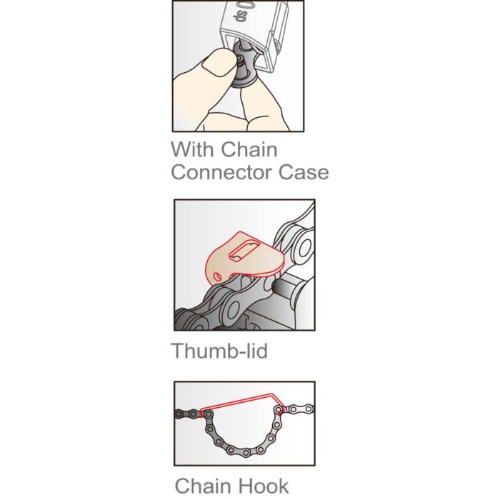 De IceToolz kettingpons beschikt over een beschermklep die voorkomt dat de ketting tijdens het gebruik losschiet. Dit zorgt ervoor dat de kettingpennen altijd goed gepositioneerd blijven voor een veilige en efficiënte werking. Het geïntegreerde opbergruimte voor schakel/link maakt het mogelijk om snel verwisselbare schakels bij de hand te hebben.