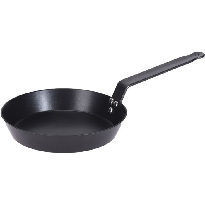 De koekenpan heeft een diameter van 24 cm en een diepte van 4 cm, met een totale lengte van 45 cm inclusief het handige metalen handvat. Het handvat zelf heeft een lengte van ongeveer 21 cm, waardoor het comfortabel in de hand ligt. De dikte van de onderkant bedraagt 3 mm, wat bijdraagt aan de duurzaamheid en de warmtegeleiding van de pan.