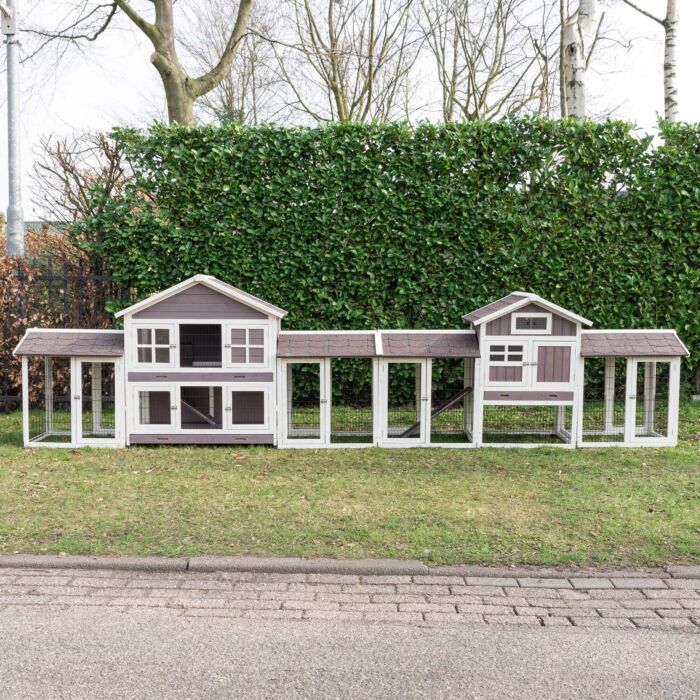 Dit konijnenhok heeft een hoogte van 133 cm, een breedte van 524,5 cm en een diepte van 70 cm. Het is gemaakt van hoogwaardige materialen die zowel duurzaamheid als veiligheid garanderen. De anti-knaagstrips voorkomen beschadigingen door de konijnen en zorgen ervoor dat het hok langer meegaat. Het traliewerk is stevig en laat voldoende luchtcirculatie toe, terwijl het ook bescherming biedt.