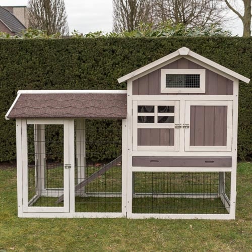 Het binnenverblijf is niet alleen ruim, maar ook praktisch ontworpen met een tussenschot, waardoor u eventueel een aparte ruimte kunt creëren voor een nieuw konijntje of om een moederkonijn met jongen gescheiden te houden. De ventilatievoorzieningen zorgen ervoor dat er voldoende luchtcirculatie is, wat essentieel is voor de gezondheid van de konijnen.