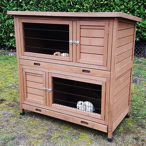 Konijnenhok Floris heeft een doordacht ontwerp met twee verdiepingen, die makkelijk van elkaar zijn te scheiden. Dit geeft de mogelijkheid om konijnen afzonderlijk van elkaar te huisvesten, wat ideaal is voor situaties waarin toezicht nodig is. Beide verdiepingen zijn uitgerust met uitneembare schuifladen, wat het schoonmaken aanzienlijk vergemakkelijkt. De deuren van het hok zijn zo ontworpen dat ze volledig geopend kunnen worden, wat zorgt voor makkelijke toegang en veelzijdigheid bij het onderhoud.