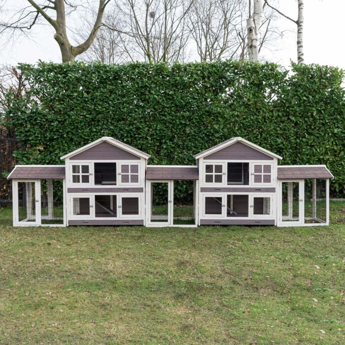 Konijnenhok Sissi Duo Giant is een plaatje om te zien en biedt een walhalla voor konijnen. Met een ruime afmeting van 486x67x133cm is er volop leefruimte voor uw konijnen om heerlijk te slapen, spelen en rond te rennen. Dit konijnenhok is ontworpen met de behoefte van uw dieren in gedachten, zodat zij zich op hun gemak voelen in hun omgeving.