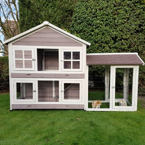 Het konijnenhok Sissi is niet alleen functioneel, maar ook doordacht ontworpen. Met 4 openslaande deuren hebben eigenaren gemakkelijk toegang tot hun konijnen, terwijl ze ook kunnen genieten van de atractieve uitstraling. De twee diepe lades onder het hok maken het schoonmaken een eenvoudige taak, waardoor het onderhoud van het hok verder wordt vergemakkelijkt. Het uitneembare paneel in de rechter zijwand zorgt ervoor dat de konijnen eenvoudig van het hok naar de ren kunnen lopen.