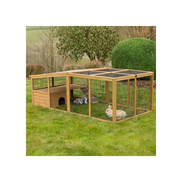 Deze ren is voorzien van een gedeeltelijk, robuust kunststof dak dat beschermt tegen zowel zon als regen. Daarnaast is er een binnenverblijf in de ren voor een knus slaapplekje en een extra plateau voor optimale leefruimte.