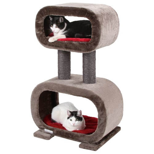 Deze krabpaal heeft twee ligplaatsen, ideaal voor twee katten. De kussentjes zijn omkeerbaar: de ene kant is grijs, de andere kant rood.