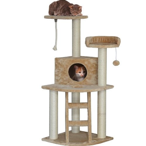 Mooie hoek krabpaal met vele mogelijkheden om je kat fit en speels te houden. Je kat kan zich heerlijk terugtrekken in het huisje of lekker hoog op het plateau liggen. Deze bestseller is ruimtebesparend en past door zijn neutrale kleuren in elk interieur