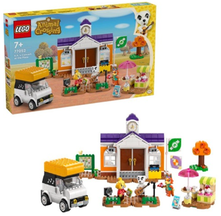 Meisjes en jongens kunnen hun eigen verhalen geïnspireerd op de Animal Crossing videogames bedenken met het K.K.’s pleinconcert (77052) bouwspeelgoed. Eerst bouwen ze de scènes van hun scherm, daarna nemen ze met de drie LEGO Animal Crossing-minifiguren en vele herkenbare speelgoedaccessoires uit de game het fantasiespel overal mee naartoe! Kinderen bereiden zich voor op het concert van K.K. door zijn speelgoedmicrofoon van het dak van de camper te halen, op de speelgoedgitaar te spelen of zich bij Isabelle aan te sluiten voor groepsgymnastiek. Ze praten bij met Audie in het café voordat ze aan de slag gaan in het gemeentehuis, waar ze een doe-het-zelfplan kunnen krijgen, beloningen kunnen inwisselen bij de geldautomaat en de recyclekist kunnen controleren op nieuwe voorwerpen. Net als in de game bevat de boom een verrassing en kan de vlag van de servicebalie worden gepersonaliseerd. Kinderen kunnen de bouwplaten anders indelen om hun LEGO Animal Crossing-set te veranderen. Geschikt vanaf 7 jaar.