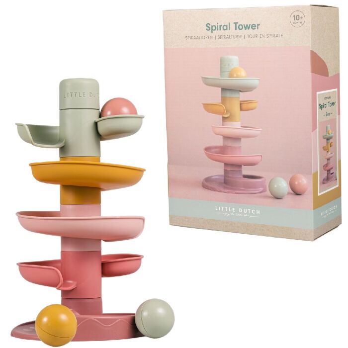Laat de bal maar rollen met de spiraaltoren van Little Dutch! Deze kleurrijke set bestaat uit 5 subtiel gekleurde delen die jouw kleintje gemakkelijk op elkaar kan stapelen. De ballen rollen een voor een op de bovenste laag en zorgen voor plezier terwijl ze achter elkaar naar beneden slingeren. De spiraaltoren draagt bij aan de ontwikkeling van hand-oogcoördinatie en leert kleintjes over oorzaak en gevolg, waardoor spelen zowel leuk als educatief wordt. De set bevat 3 lichte en gemakkelijk vast te pakken ballen in verschillende kleuren die geluid maken bij beweging. De afmetingen zijn 18 x 18 x 30 cm en het speelgoed is uitgevoerd in de kenmerkende Little Dutch kleuren oudroze, roze, lichtroze, groen en okergeel. Geschikt voor kinderen vanaf 10 maanden. Verpakt in een full-colour doos.