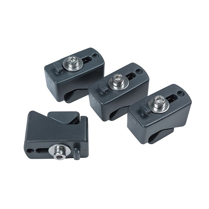 De bevestigingsset bestaat uit vier stuks en de buitenwerkse afmetingen zijn 4 x 2 x 3 cm. De set is vervaardigd uit duurzame materialen die zijn ontworpen om een lange levensduur te bieden onder uiteenlopende fietsomstandigheden.