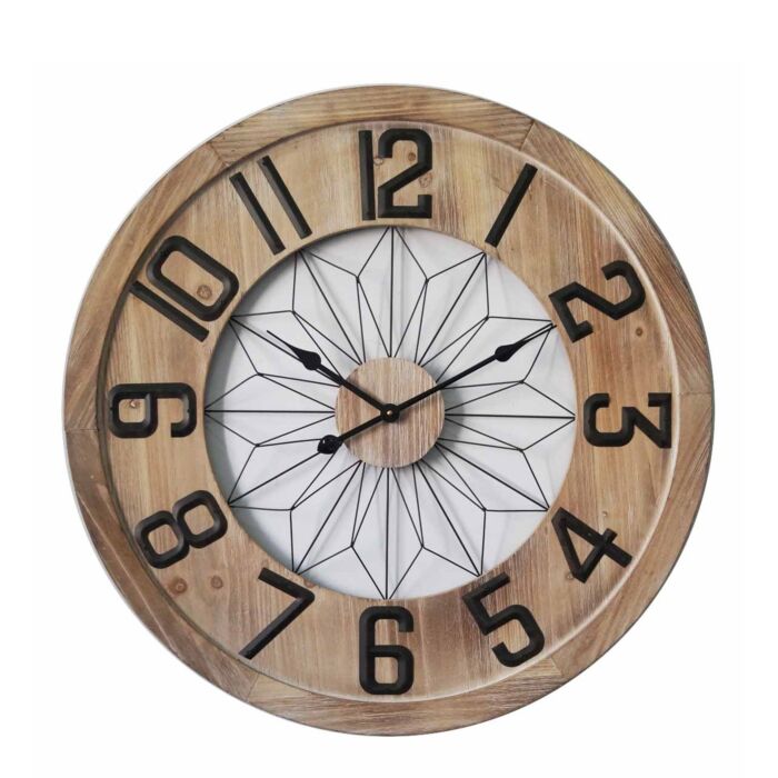 De klok heeft een diameter van 80 cm en een dikte van 4,5 cm, waardoor hij een krachtige aanwezigheid in uw interieur heeft. Het hoogwaardige metaal en de warme houten accenten zorgen voor een robuuste, luxe uitstraling die lang meegaat.