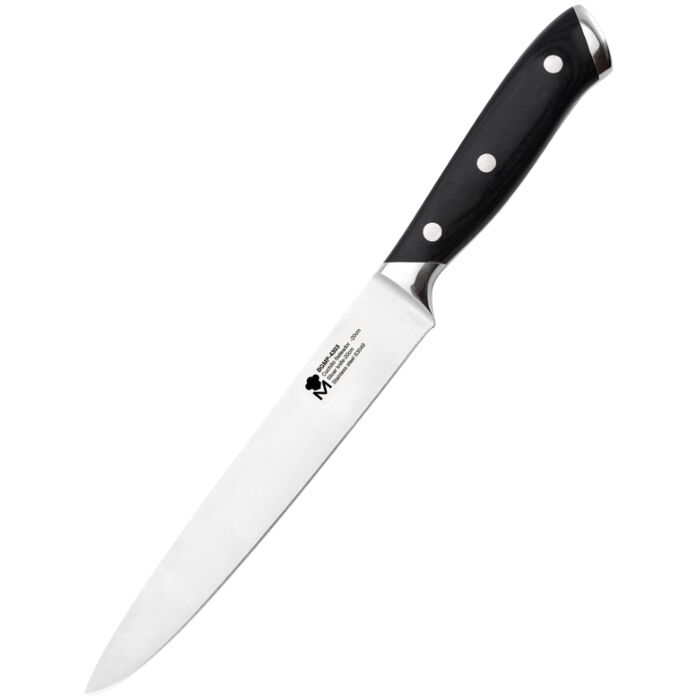 Dit hoogwaardige vleesmes is een essentieel onderdeel van elke keuken en is ontworpen om met precisie en gemak te snijden. Het lemmet van 20 centimeter is perfect voor het trancheren van vlees, vis en gevogelte in gelijkmatige plakken. Met zijn lange en slanke ontwerp zorgt dit mes ervoor dat je eenvoudig en moeiteloos door je ingrediënten snijdt, waardoor het een must-have gereedschap is voor elke culinaire liefhebber.