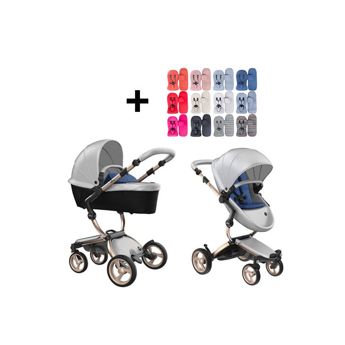 Mima Xari Kinderwagen | Onderstel - Champagne | Zitje + Kap - Argento | Startpakket - Denim Blue