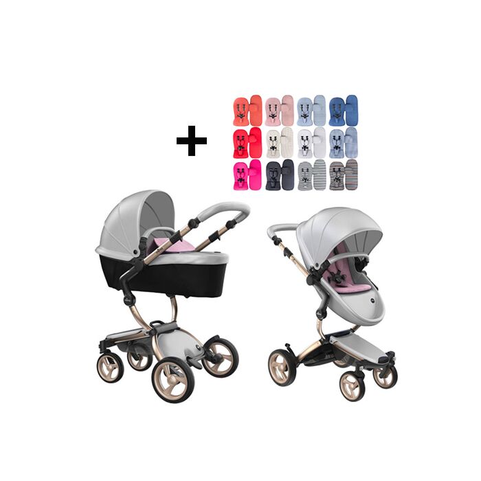 Mima Xari kinderwagen | onderstel – champagne | zitje + kap – argento | startersset – pixel pink