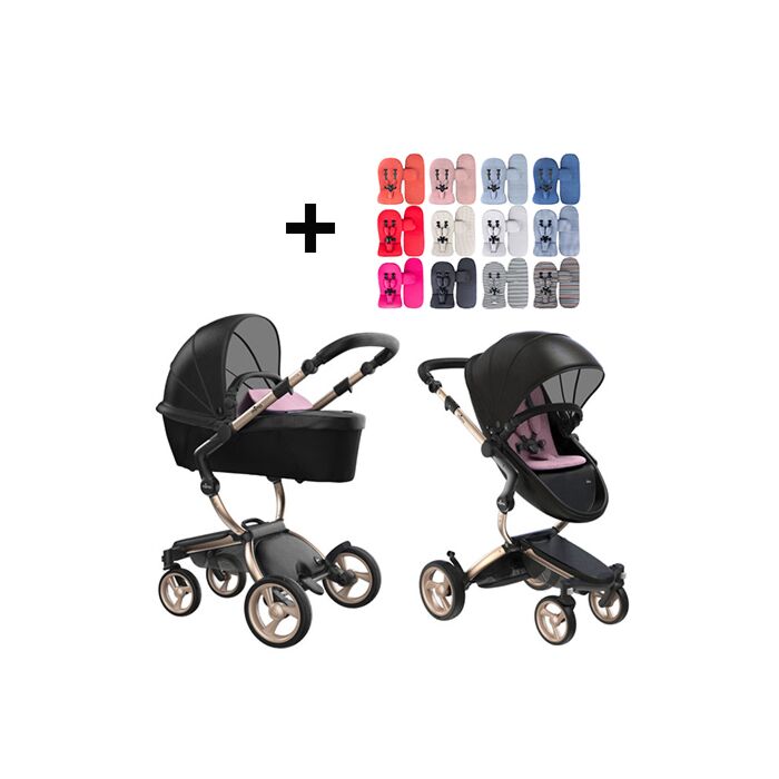 Mima Xari Kinderwagen | Frame – Champagne | Zitting + Kap – Zwart | Starterpakket – Pixel Pink