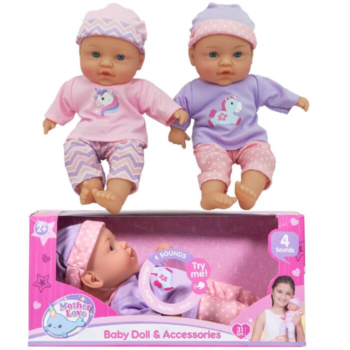 De Mother Love pop is een schattige pop met een zacht lijfje van 31 cm groot. Deze pop is voorzien van 4 verschillende geluiden, waaronder uitspraken als "Mama", "Papa", "Haha" en "Wah". Het geluid wordt geactiveerd door op de buik van de pop te drukken, waardoor kinderen urenlang speelplezier kunnen beleven. De pop wordt geleverd in 2 assorti kleuren en bevat 2 AG3 knoopcelbatterijen in de try-me verpakking.