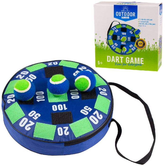 Het dartbord heeft een diameter van 36 cm en is gemaakt van duurzaam materiaal, dat bestand is tegen buitengebruik. De set wordt geleverd met drie kleurrijke ballen die perfect zijn voor het spelen van het dartspel.