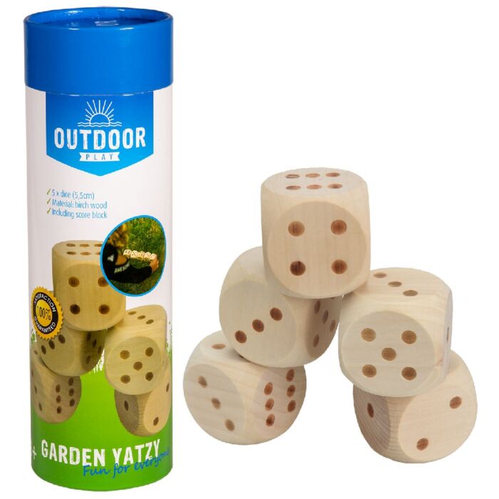Outdoor Play Garden Yatzy. Speel de leukste dobbelspellen nu ook in de tuin! Deze set bevat 5 houten dobbelstenen van 5,5 x 5,5 x 5,5 cm en een scoreboekje om de resultaten bij te houden. De dobbelstenen worden geleverd in een full-colour koker met een uitgebreide handleiding voor verschillende spellen. Deze set is speciaal ontworpen voor kinderen vanaf 6 jaar om plezier te beleven met buitenactiviteiten en helpt bij de ontwikkeling van strategisch denken en sociale interactie.