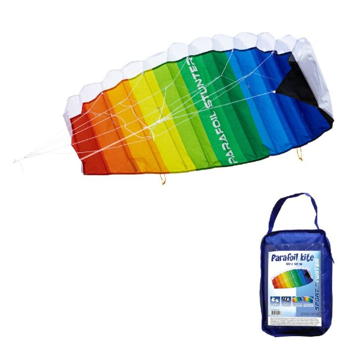 De Parafoil Stunter 120x50 Tas is een Parafoil M-stuntervlieger in vrolijke regenboogkleuren, ontworpen voor de beginnende vliegeraars. Gemaakt van hoogwaardig ripstop nylon biedt deze vlieger duurzaamheid en stabiliteit in de lucht. De set bevat 30 meter lijnen en een handige tas voor transport. Met een afmeting van 120 x 50 cm is deze vlieger geschikt voor kinderen vanaf 6 jaar en kan hij worden gebruikt bij windkracht 3 tot 5 Beaufort.