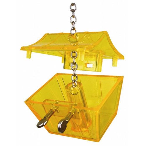Draai en trek aan de twee schatkistsleutels om de schatkist te openen. Plaats er iets van vruchten, groenten of een andere gewilde lekkernij in en draai de schatkistsleutels terug in de gesloten stand. Hang de speelhanger duidelijk in het zicht van uw papegaai en kijk hoe snel de vogel zijn of haar natuurlijke instincten zal gebruiken om de schatkist te openen.