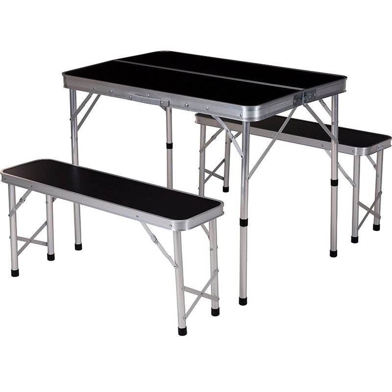 De picknicktafel heeft een afmeting van 90 x 60 cm en een hoogte van 70 cm, terwijl de banken 24 x 87 cm meten met een zithoogte van 40 cm. Het geheel is gemaakt van lichtgewicht, maar stevig aluminium, wat zorgt voor een lange levensduur en eenvoudig onderhoud.