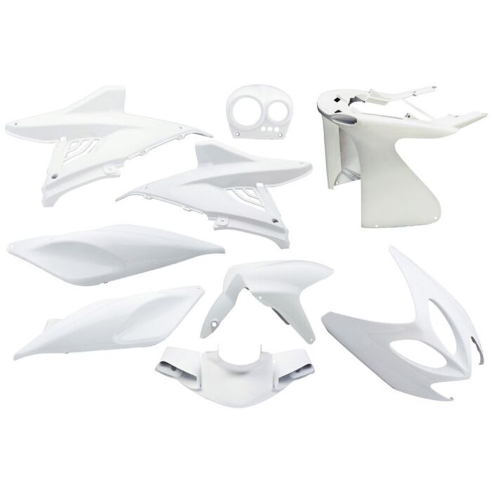 - Inclusief 9 delen: voorspatbord, zijschermen (links en rechts), motorschermen (links en rechts), voorfront, onder deel voorfront, stuurkap voorzijde, tellershuis