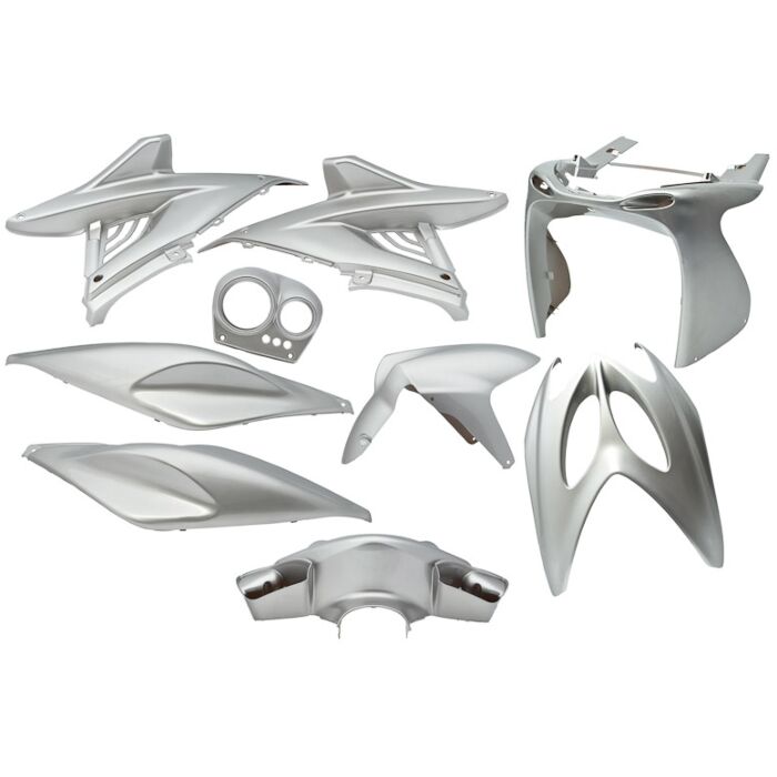 De kappenset is vervaardigd uit duurzame kunststof, speciaal ontworpen om te weerstaan aan slijtage en blootstelling aan verschillende weersomstandigheden. Elk onderdeel is nauwkeurig gemonteerd om ervoor te zorgen dat ze perfect aansluiten bij de originele ontwerpen. De zilver metallic afwerking voegt een moderne touch toe aan de uitstraling van je scooter, waardoor deze opvalt in het verkeer.