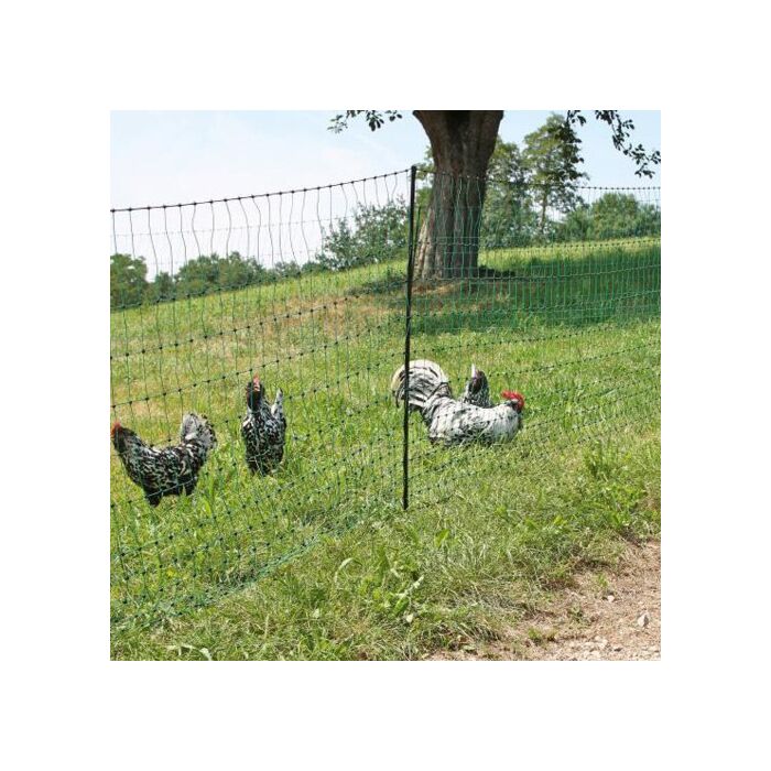 Dit groen gekleurde afrasteringsnet met geïntegreerde stroomdraden en kunststofpalen met dubbele pennen is ideaal om uw pluimvee veilig binnen de gewenste zone te houden.