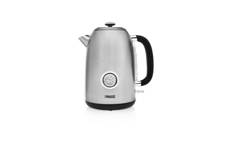 PRINCESS 236028 waterkoker Retro – 1,7 L Inhoud: 1,7 liter Materiaal: roestvrij staal Voorzien van temperatuurmeter voor eenvoudige aflezing van de watertemperatuur