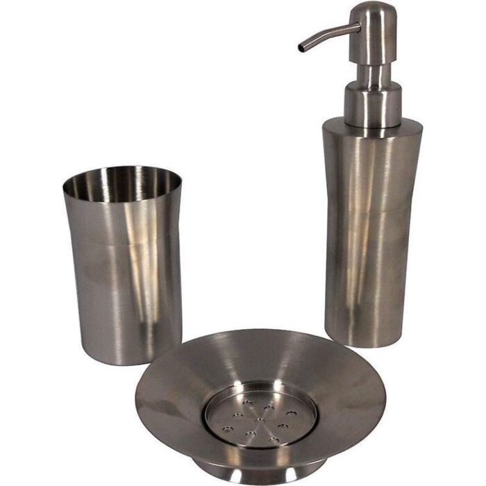 De set omvat een zeepdispenser met afmetingen van 19x5,5 cm, een beker van 10x7 cm en een zeepbakje met een diameter van 12,5 cm. Alle onderdelen zijn gemaakt van roestvrij staal, waardoor ze bestand zijn tegen vochtige omgevingen en eenvoudig schoon te maken zijn.