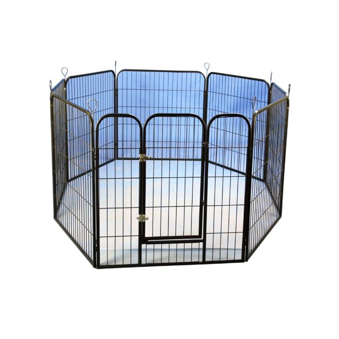 Deze stevige 8-delige puppyren is ontworpen voor optimale veiligheid en comfort voor uw viervoeter. Met panelen van 80x80 cm kunnen de delen eenvoudig met elkaar worden verbonden met behulp van lange pennen. De ren is uitgerust met een handige deur, waardoor u gemakkelijk in en uit kunt stappen. Deze puppyren biedt een ideale omgeving voor jonge pups om te spelen en te wennen aan hun nieuwe omgeving.